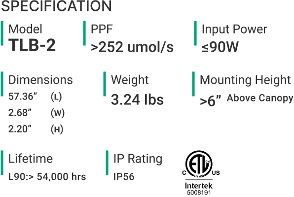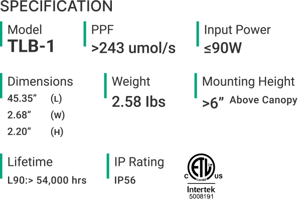 Combined with the driver, the Model One LED light bars are pure plug-and-play systems, with the ability to be modular. The Model One LED light bars are high-performing LED grow lights that come equipped with SAMSUNG white-based full spectrum diodes. These diodes were specifically designed for crop cultivation and have proven to be the best on the market.